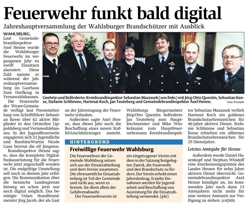 Gemeinnützigkeit des Vereins in Gefahr Alle drei Jahre muss der Feuerwehrverein eine Steuererklärung abgeben. Der Vereinsvorsitzende Jürgen Pape und Kassierer Peter Hummel beklagten sich angesichts der kürzlich stattgefundenen Jahreshauptversammlung über die neuen Auflagen des Finanzamtes. Das Ehrenamt wird immer mehr in Frage gestellt. Die Ausgaben für die „Annehmlichkeiten“ pro Person dürfen die Mitgliedseinnahmen nicht überschreiten. Da die Feuerwehr Lippoldsberg lediglich 12 € im Jahr als Mitgliedsbeitrag nimmt, ist der Spielraum nicht groß. Zu diesen „Annehmlichkeiten“ zählen unter anderem die Verpflegung nach Übungen oder die Kosten der Jahreshauptversammlung. Wenn die jetzt übliche Vorgehensweise nicht geändert wird, dann erkennt das Finanzamt die Gemeinnützigkeit des Vereins ab. Diese Bürokratie ist kaum noch zu bewältigen. Immerhin handelt es sich hier um eine Freiwillige Feuerwehr, deren Mitglieder ihre Arbeit ehrenamtlich ausüben, ihre Freizeit für die Bevölkerung opfern und dann nicht mal nach einem Unterrichtsabend eine Bratwurst essen dürfen. Der Vorstand überlegt nun, ob ein Steuerberater sinnvoll wäre. Des Weiteren musste über eine Satzungsänderung bzgl. der Verfolgung gemeinnütziger Zwecke abgestimmt werden. Auch diese Änderung gibt es nur auf Wunsch des Finanzamtes. Der Berichtsschwerpunkt der Wehrführung lag neben dem Rückblick auf die Einsätze und besondere Veranstaltungen hauptsächlich auf den Spenden. Durch einen privaten Spender hat die Feuerwehr Lippoldsberg einen gebrauchten Rüstsatz (Schere/Spreizer), ein Glasmanagement-System und eine akkubetriebene Säbelsäge erhalten. Nun ist die Feuerwehr auch in Sachen technische Hilfeleistung gut aufgestellt. Dass dies auch wichtig sei, da dieser Einsatzschwerpunkt immer häufiger vorkomme, betonte die Wehrführung. Im Jahr 2015 steht also vermehrt die technische Hilfeleistung auf dem Dienstplan, um den Umgang mit den neuen Geräten zu üben. An dieser Stelle bedankte sich die Wehrführung noch einmal recht herzlich für die Unterstützung des Spenders. Ein weiterer fester Bestandteil des Dienstplanes ist der wöchentliche Dienstsport, der seit Juli 2014 eingeführt wurde. Da die körperliche Fitness der Einsatzkräfte sehr wichtig ist und Sport in einer Gruppe leichter fällt, wurde der Dienstsport ins Leben gerufen. Es gab sogar drei Kameraden, die einen Trainerlehrgang besucht haben, um den Sport effektiv gestalten zu können. Für die 14 Mitglieder der Jugendfeuerwehr gab es im letzten Jahr einige besondere Highlights auf dem Dienstplan. Die Jugendfeuerwehr Lippoldsberg nahm z. B. an der Aktion „Laufen statt Saufen“ teil, besichtigte den Flughafen Hannover inkl. der Flughafenfeuerwehr und führte einen 24-Stunden-Dienst wie die Berufsfeuerwehr durch. Auch die Bambinifeuerwehr war sehr aktiv. Besonders toll fanden es die elf Kinder der Bambinifeuerwehr, wenn sie wie die Großen üben konnten und mit den großen Autos unterwegs waren. Wenn man den Berichten der einzelnen Gruppen folgte, dann fiel auf, dass sich einige Dienste überschnitten. So übte die Jugendfeuerwehr gemeinsam mit der Einsatzabteilung und die Bambinifeuerwehr unternahm gemeinsame Ausflüge mit der Jugendfeuerwehr. Diese Überschneidungen sind wichtig, damit der Übergang erleichtert wird und es keine Berührungsängste gibt. Ehrungen 25 Jahre Mitgliedschaft Matthias Bittmaier, Georg-Moritz Grimm, Andreas Mascher, Stefanie Feyk, Bernd Peschmann, Thomas Plünnecke 40 Jahre Mitgliedschaft Albert Koch, Sieghard Maage, Werner Schiwatsch 50 Jahre Mitgliedschaft Helmut Reins 60 Jahre Mitgliedschaft Erich Bodenhausen, Hermann Schulte 70 Jahre Mitgliedschaft Fritz Don Aktivster der Jugendfeuerwehr Fabian Feyk Aktivster der Einsatzabteilung Raphael Niemeyer Besondere Dienste Dirk Schlimme als Gerätewart