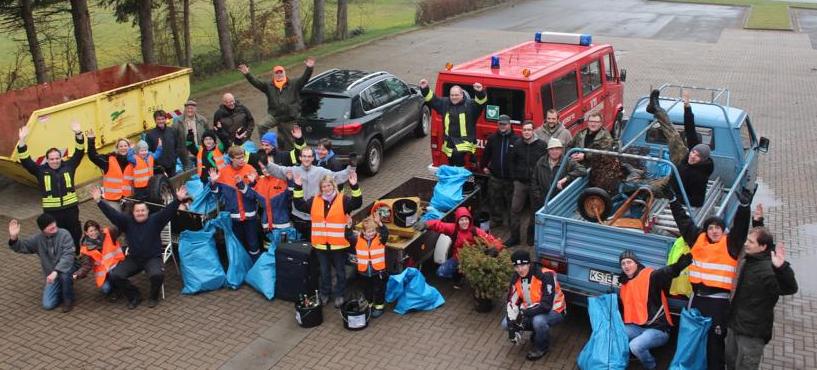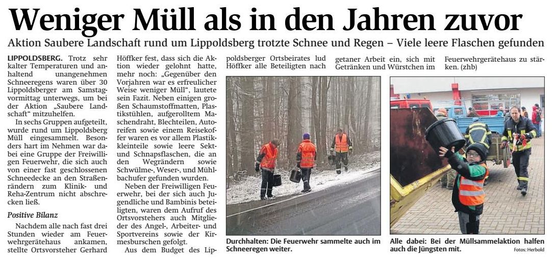 | Bereits am Samstag Vormittag trafen sich Mitglieder der Bambini, Jugendfeuerwehr und Einsatzabteilung um wieder Rund um Lippoldsberg Ordnung zu schaffen und die Landschaft vom Müll zu befreien. Auch aus den anderen Lippoldsberger Vereinen waren zahlreiche Mitglieder der Einladung vom Ortsvorsteher Gerhard Höffker gefolgt und beteiligten sich an dieser Aktion. Im anfänglichen Schneegestöber schwärmten wir aus und sammelten Säckeweise Müll und allerhand andere kuriose Gegenstände die achtlos weggeschmissen wurden. Mittags trafen sich dann noch einmal alle Teilnehmer zur gemeinsamen Stärkung im Feuerwehrhaus. |