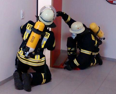 Am Samstag Nachmittag trafen sich unsere Atemschutzgeräteträger, um sich zusätzlich zu den normalen Diensten auch noch im Umgang mit dem Atemschutzgerät weiterzubilden. Nach einem kurzen Theorieteil wurde die Persönliche Schutzausrüstung angelegt und kontrolliert. Thema war die Türöffnung und Personensuche im verqualmten Raum. Nach kurzer Vorbesprechung wurden die Geräte angelegt und auf Funktionsfähigkeit geprüft. Truppweise mit fast Null Sicht ging es dann, (dank zugeklebter Masken), auf dem Fußboden durchs Feuerwehrhaus. Organisator Mike ging auf sämtliche Abläufe ein und gab uns viele wertvolle Tipps zur Türöffnung, zum Umgang mit der Fluchthaube Respihood und der Selbstrettung im Notfall. Alles in allem eine absolut wichtige Art der Weiterbildung die künftig regelmäßig durchgeführt werden soll. |