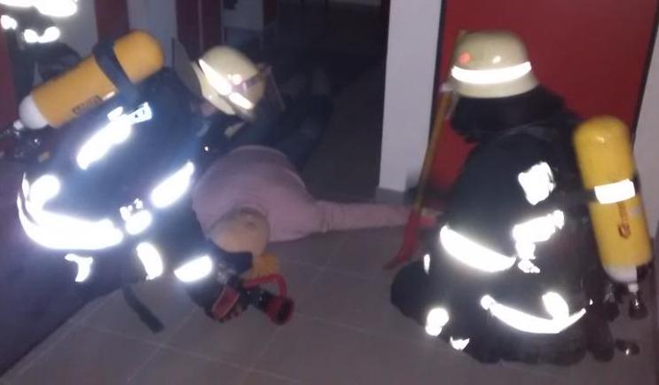Im Inneren wurde schon nach kurzer Zeit die erste Person gefunden und konnte mit Schleifkorbtrage aus dem Gebäude gebracht werden. Nun kam der zweite Atemschutztrupp zum Einsatz und holte unverzüglich die zweite Person mit Hilfe eines Tragetuches ebenfalls ins Freie. Beide wurden zur Verletztensammelstelle gebracht und man konnte sich nun voll und ganz auf die Löschmaßnahmen konzentrieren. Schon nach kurzer Zeit konnte "Feuer Aus" gemeldet werden und das Übungsziel war erreicht. Bei der kurzen Abschlussbesprechung vor Ort waren sich alle einig das trotz der dünnen Personalsituation an dem Abend alles perfekt geklappt hatte.