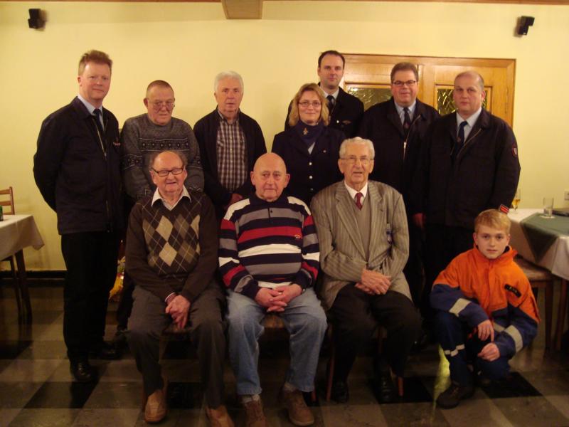 Anwesende Geehrte Von links hinten: Jürgen Pape (1. Vorsitzender), Werner Schiwatsch, Helmut Reins, Stefanie Feyk, Bernd Peschmann, Dirk Schlimme, Andreas Schlimme (Stellvertretender Wehrführer) Von links vorne: Erich Bodenhausen, Hermann Schulte, Fritz Don, Fabian Feyk |