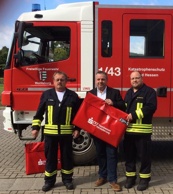 Auf dem Bild von links nach rechts: Axel Henne (GBI Wahlsburg), Christian Kindling (Sparkassenversicherung), Björn Husemann (Wehrführer FF Lippoldsberg) |