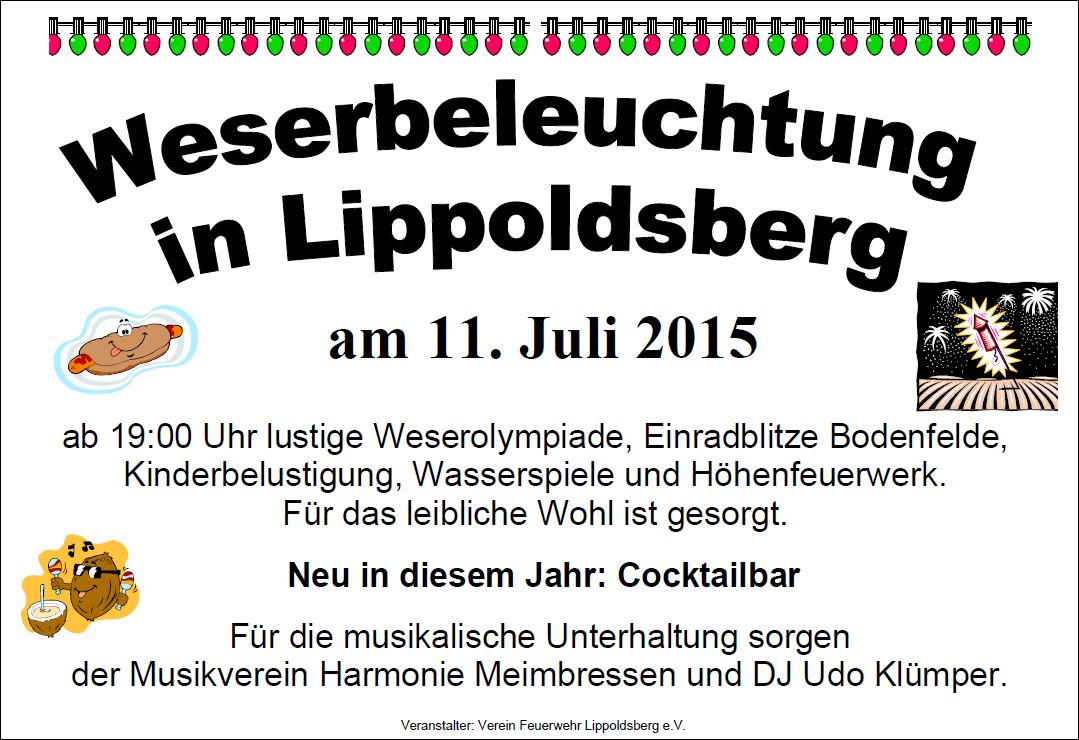Termine Osterfeuer an der Weser 05.04.2015 Aufstellen des Maibaums 01.05.2015 Weserbeleuchtung 11.07.2015 Wandertag 13.09.2015 |