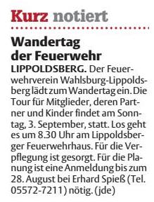| Zur gemeinsamen Übung mit der Feuerwehr Bodenfelde trifft sich die Einsatzabteilung am Freitag den 15.September 2017 um 18:00 Uhr. |