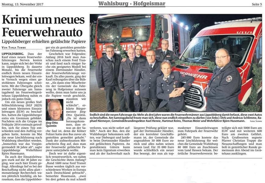 Moderne Ausrüstung und gute Tages-Einsatzbereitschaft in Lippoldsberg Im Jahr 2016 starteten gleich zwei Ersatzbeschaffungen für die Freiwillige Feuerwehr in Lippoldsberg. Wehführer Björn Husemann berichtete, dass die Ausschreibung für die Ersatzbeschaffung des in die Jahre gekommenen Tanklöschfahrzeuges 16/25 durchgeführt und der Auftrag vergeben wurde. Das neue Fahrzeug wird ein Staffellöschfahrzeug (StLF) 20/25 auf einem MAN-Fahrgestell und mit einem Aufbau von Rosenbauer. Der Liefertermin ist für Mitte Mai vorgesehen. Des Weiteren wird der Einsatzleitwagen (ELW) ersetzt, welcher im Dezember 1989 erstmals zugelassen wurde. Die Gemeinde hat bereits einen gebrauchten Ford Transit L2H2 gekauft. Aktuell befindet sich das neue Fahrzeug in Kassel zum Innenausbau und Einbau der Funkanlage. Auch hier ist der Plan, das Fahrzeug spätestens im Mai in Betrieb zu nehmen. Sobald beide Fahrzeuge fertig sind und geliefert wurden, wird es einen offiziellen Übergabetermin geben, bei denen alle herzlich eingeladen sind. Die Kosten für die beiden neuen Fahrzeuge muss die Gemeinde nicht alleine tragen. Der Feuerwehrverein beteiligt sich mit insgesamt 5000 € an der Ersatzbeschaffung für den ELW und mit 600 € an einer Heckwarneinrichtung für das neue StLF. Seit Dezember 2016 verfügen die Einsatzkräfte der Feuerwehr Lippoldsberg über eine Wärmebildkamera. Diese Kamera ist nicht nur bei Bränden hilfreich um z. B. versteckte Glutnester zu finden, sondern auch für die Personensuche einsetzbar. Besonders hervorzuheben ist die derzeitige Tages-Einsatzbereitschaft. Aktuell kann die Feuerwehr Lippoldsberg auf ca. 14 Einsatzkräfte, darunter sechs Atemschutzgeräteträger am Tage zurückgreifen. Dies ist nicht überall selbstverständlich, da viele außerhalb arbeiten. Aber auch die Feuerwehr Lippoldsberg hat derzeit Nachwuchssorgen, besonders in der Jugendfeuerwehr. Aufgrund der stark zurückgegangenen Mitgliederzahl in beiden Ortsteilen von Wahlsburg wurde die Jugendfeuerwehr zum 31.03.2016 zusammengelegt, berichtete Jugendwart Thomas Meier. Die Lippoldsberger und Vernawahlshäuser Jugendfeuerwehr übt nun gemeinsam. Zum Ende des Jahres zählte die Jugendfeuerwehr aber lediglich neun Mitglieder. Interessierte können jederzeit zu einem Schnuppertermin vorbeikommen. Treffen ist jeden Dienstag um 17:45 Uhr an dem jeweiligen Gerätehaus. Die Bambinifeuerwehr Lippoldsberg kann seit der zweiten Jahreshälfte 2016 ebenfalls auf zwei Nachwuchskräfte aus Vernawahlshausen zählen, teilte Bambiniwartin Nicole Husemann mit. Bevor man die interessierten Kinder verliert, weil es so ein Angebot in Vernawahlshausen nicht gibt, hat man sich hier auch für eine ortsübergreifende Zusammenarbeit entschieden. Negativ aufgefallen sei leider die Teilnahme der passiven Mitglieder an der Jahreshauptversammlung, so Vorsitzender Peter Gottlob. Lediglich 33 Lippoldsberger nahmen an der Versammlung teil. Eine größere Beteiligung wäre wünschenswert.Bericht: N.Husemann |