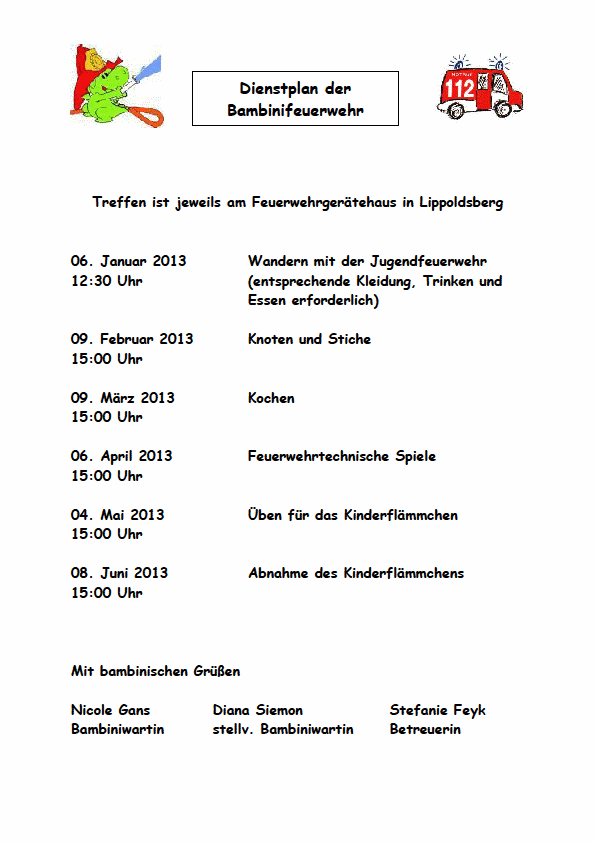 Hier ist er der neue Bambinidienstplan für das erste Halbjahr 2013