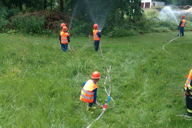 Mit Saugschläuchen und dem LF haben wir Wasser aus dem Mühlgraben entnommen und mit drei D-Rohren eine brennende Tonne gelöscht. Anschließend haben wir noch die Wurfweite des Monitors getestet.