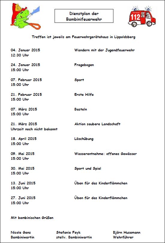 28. Dezember 2014 Der neue Dienstplan für das erste Halbjahr 2015 ist da