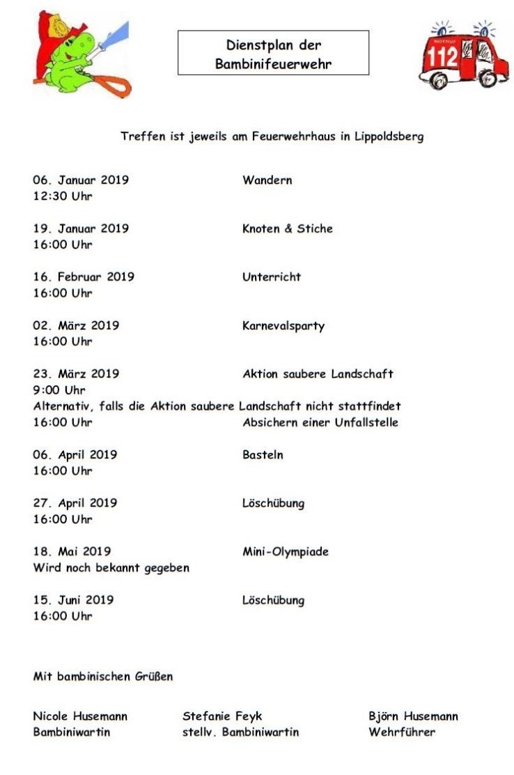 23.Dezember 2018 Der neue Dienstplan für das erste Halbjahr 2019 ist online:
