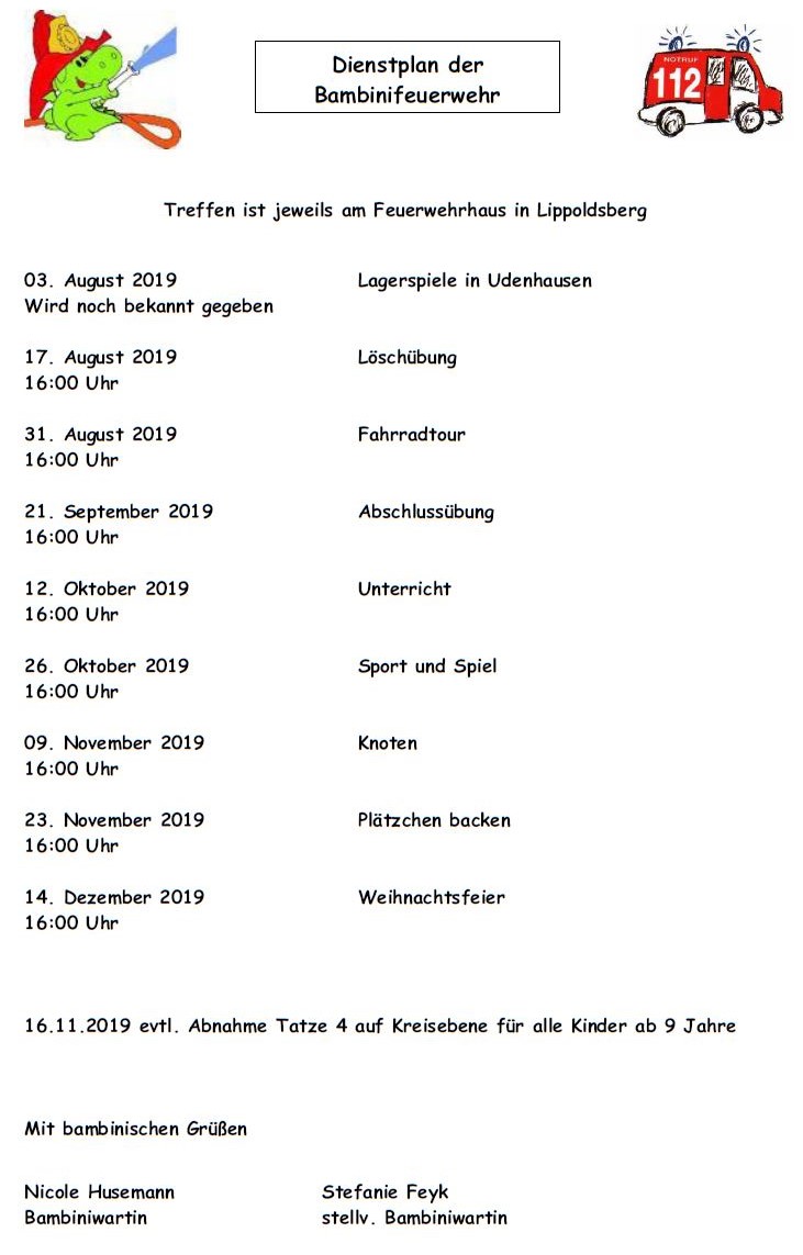 19.Juli 2019 Der neue Dienstplan für das zweite Halbjahr 2019 ist online: