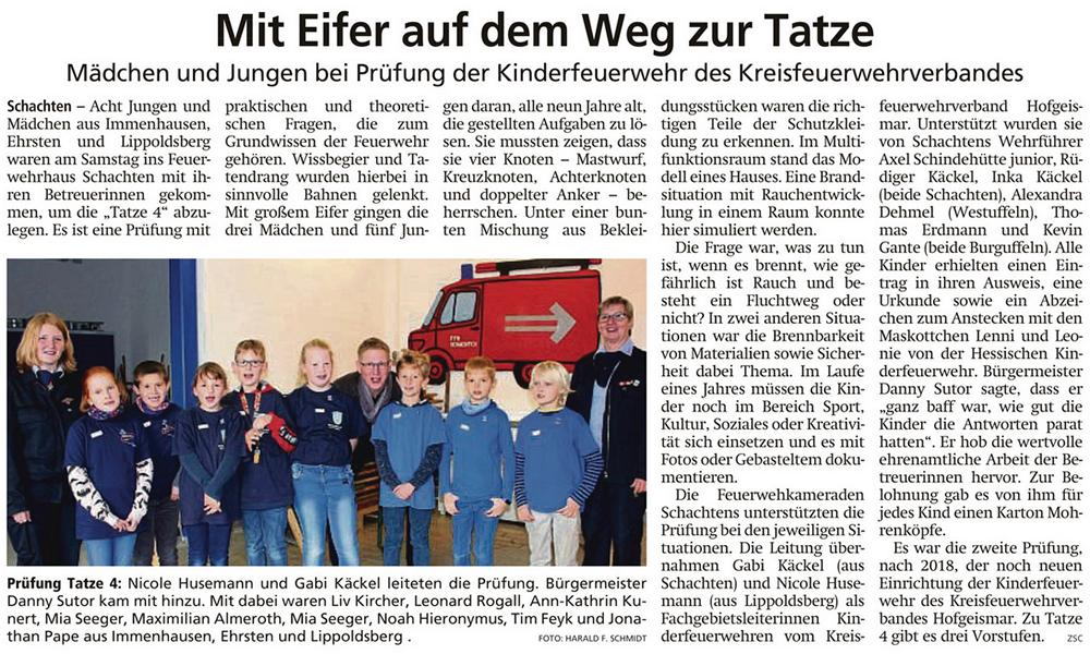 Das Kinderfeuerwehrabzeichen „Tatze 4“ ist das höchste Abzeichen für hessische Kinderfeuerwehren. Dieses wird einmal im Jahr auf Kreisebene abgenommen. Mitmachen können alle Kinder ab 9 Jahren. Aus diesem Grund war heute, am 16.November 2019, ein Teil der Bambinifeuerwehr bei der Feuerwehr in Schachten zu Gast. Nach einer kurzen Begrüßung und Einweisung der Fachgebietsleitung des Kreisfeuerverbandes Hofgeismar ging es in Kleingruppen zu den einzelnen Stationen. Insgesamt gab es fünf Stationen zu bewältigen. Als erstes ging es für uns Lippoldsberger an den Knotenbalken, an dem jeder Teilnehmer zwei unterschiedliche Feuerwehrknoten zeigen musste. Anschließend beschäftigten wir uns mit der Frage, welche Materialien brennbar sind und welche nicht. An einem sogenannten Rauchhaus wurden das richtige Verhalten im Brandfall und das Absetzen eines Notrufes besprochen. Die persönliche Schutzausrüstung eines Feuerwehrmannes und der richtige Umgang beim Anzünden einer Kerze waren weitere Stationen. Zusätzlich mussten alle Gruppen anhand von Bildern oder etwas Gebastelten zeigen, dass sie Teamgeist besitzen oder kreativ oder sportlich aktiv sind. Wir hatten eine kleine Fotocollage mit Bildern vom Plätzchen backen, von der letzten Karnevalsparty und von unserem Fahrradausflug zum Minigolfen mitgebracht. Alle Kinder haben an diesem Nachmittag eine super Leistung gezeigt und natürlich stolz ihr Abzeichen und die Urkunde entgegen genommen. Das Fazit der Veranstalter: Ihr seid tolle Feuerwehrleute von übermorgen.