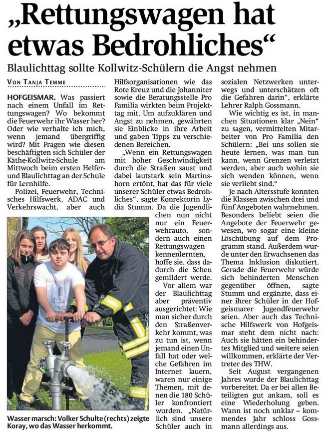------------------------------------------------------------------------------------------------- 08.Mai 2014 Brandschutzerziehung an der Käthe-Kollwitz-Schule Hofgeismar