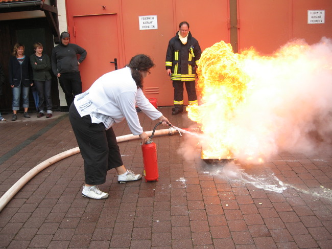 ![]() | Hier lernen Angestellte des Kindergartens Vernawahlshausen den richtigen Umgang mit einem Feuerlöscher. Solche Übungen gab es auch schon am Altenhilfezentrum Lippoldsberg, am Kindergarten Lippoldsberg und an der Grundschule. |